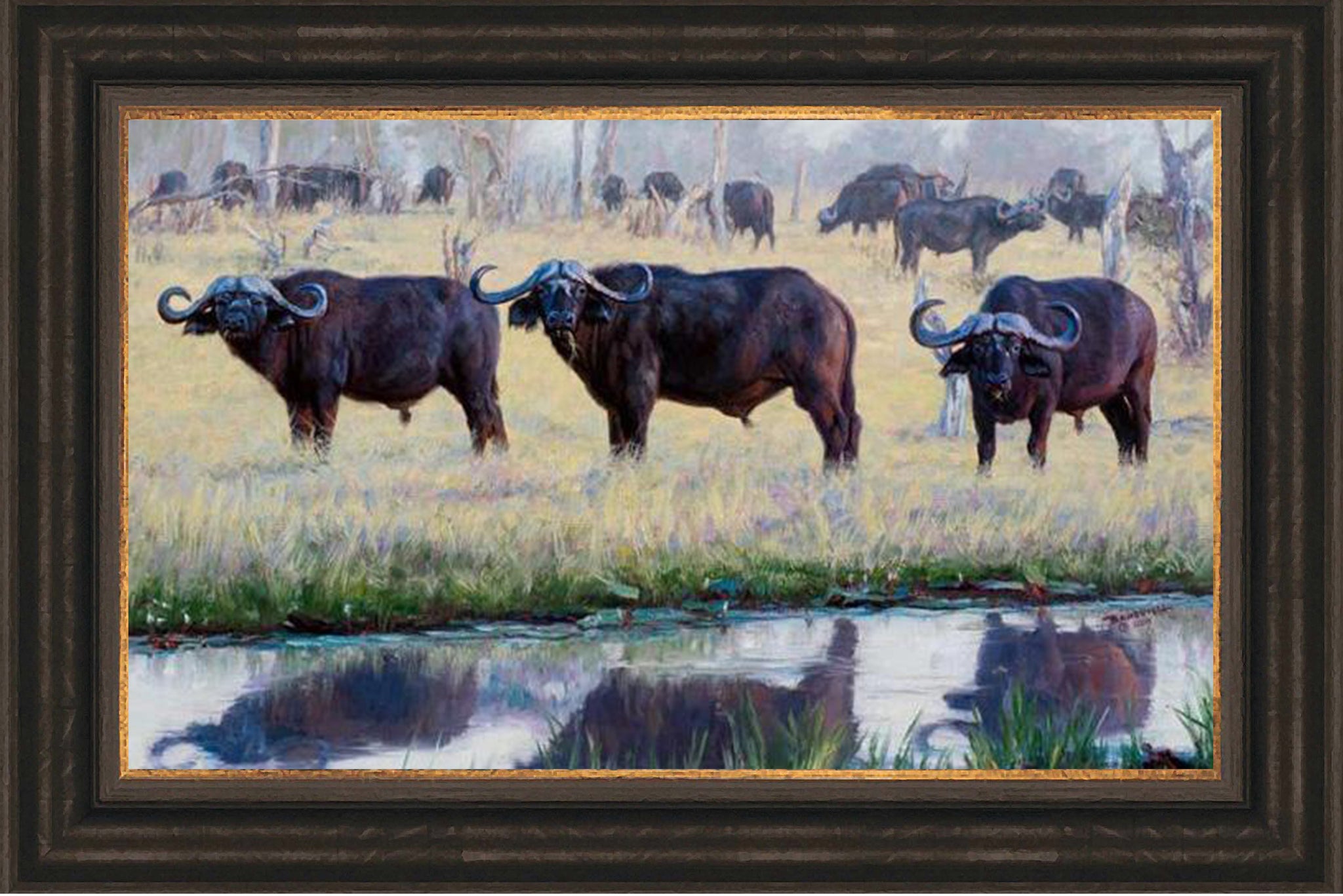 "To see a large cape buffalo bull is always an awesome sight. But to see three “mbogos" each with over forty inch horns side by side is really quite impressive. This trio was found in Botswana’s Okavango Delta as a large heard foraged along the Kwai River. What appeared as a somber moment turned dramatic as something set them off and they thundered across the shallows of the rivers unbridled edge." - John Banovich, Artist