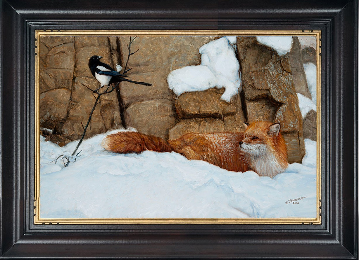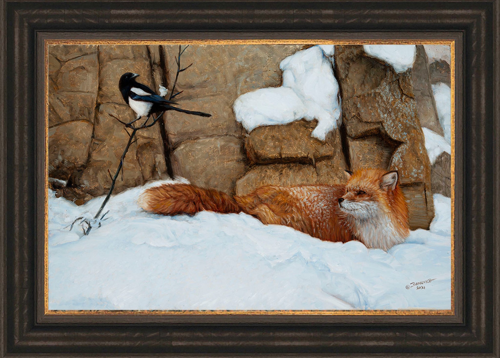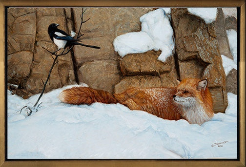 Winter is a season where many things slow down and brings a silence to nature. Many birds have flown south for the winter but magpies and ravens stay put and often benefit from hanging close to wolves, coyotes and foxes. This relationship has evolved for millions of years and each one benefits in the presence of the other. Here, this old male fox seems to enjoy the company of a magpie perched on the alder branch enjoying the dashes of red in a frozen world.